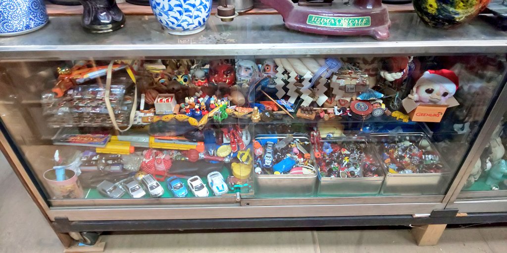 ショーケースに詰め詰めなレトロ玩具たち。解説パネルがあれば良いのですが笑。