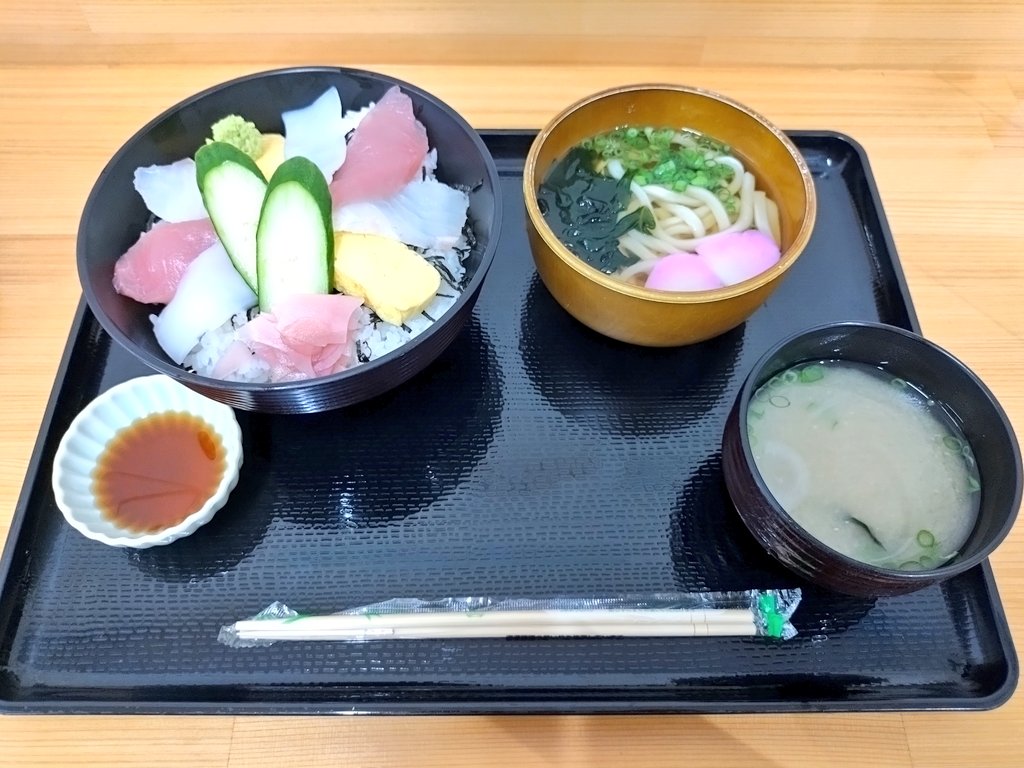 ちなみに「どんぶり館あおぞら」では、1杯640円と価格破壊された海鮮丼が名物とのこと。せっかくなので、ミニうどんを追加しランチに。改めて見るとイメージ画像と実物に差を感じてしまう笑。もっと刺身が欲しいところですが、このお値段では文句は言えませんね。海鮮丼は1日10食限定なのでご注意を!